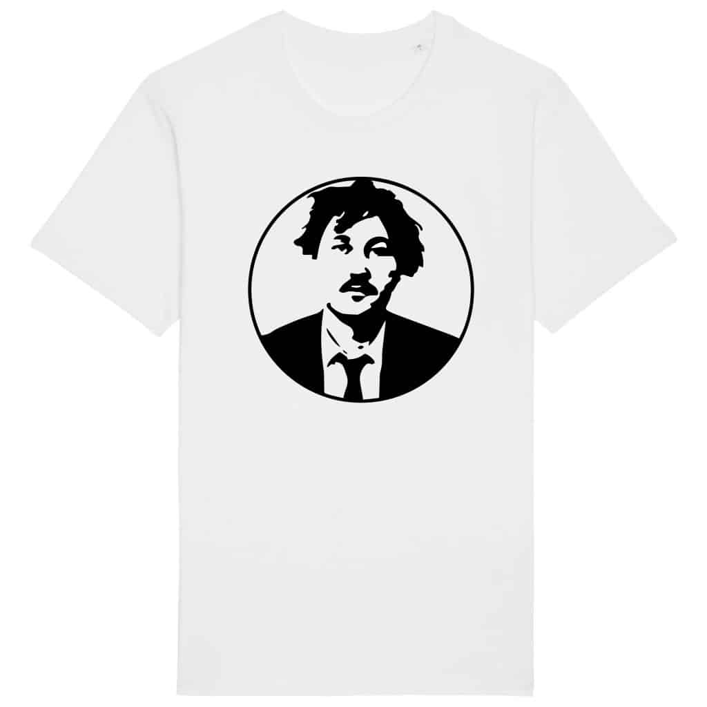 Hvit t-skjorte med sort trykk på brystet.