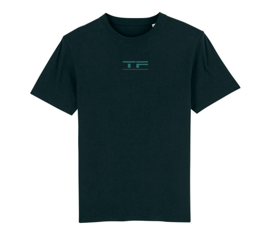 Sort t-shirt med enten gull, grønn eller sort "TF"-brodering.