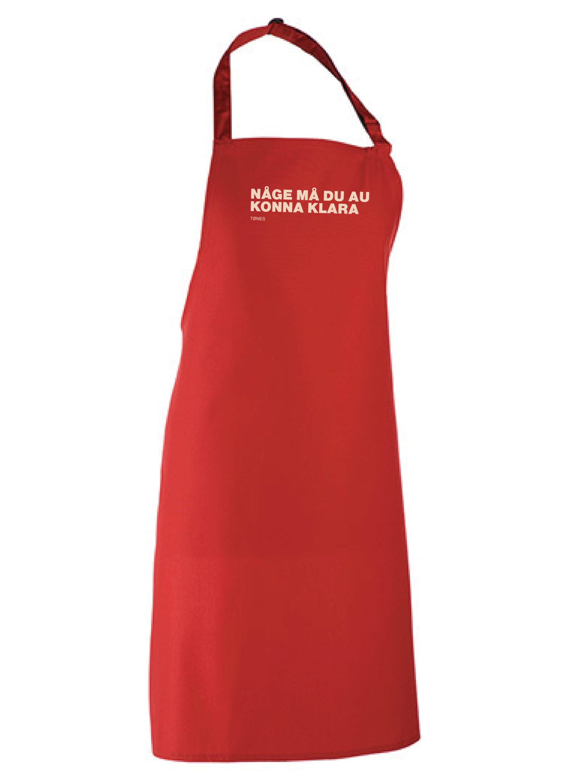 Rødt forkle med sitat trykket på brystet.